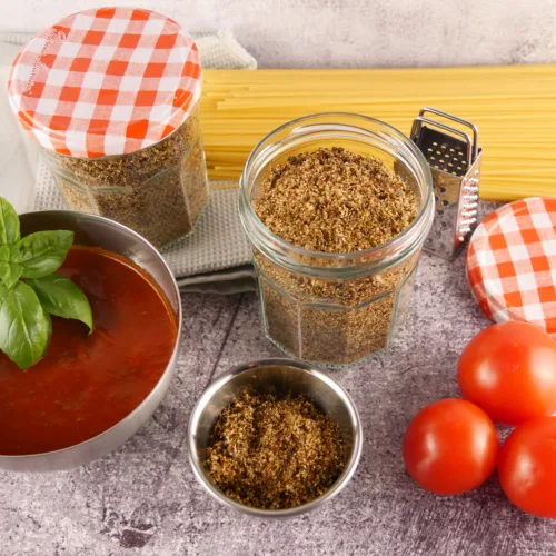 3 EL Salz (flach gehäuft), 1 EL Selleriesalz, 2 EL Basilikum gerebelt, 2 EL Oregano gerebelt, 2 EL Zwiebel granuliert, 1 EL Zucker oder Kokosblütenzucker, 1 EL Gemüsebrühpulver (flachgehäuft), 2 TL Knoblauch granuliert, 1 TL Thymian gerebelt, 1 TL Paprikapulver edelsüß, 0,5 TL Pfeffer