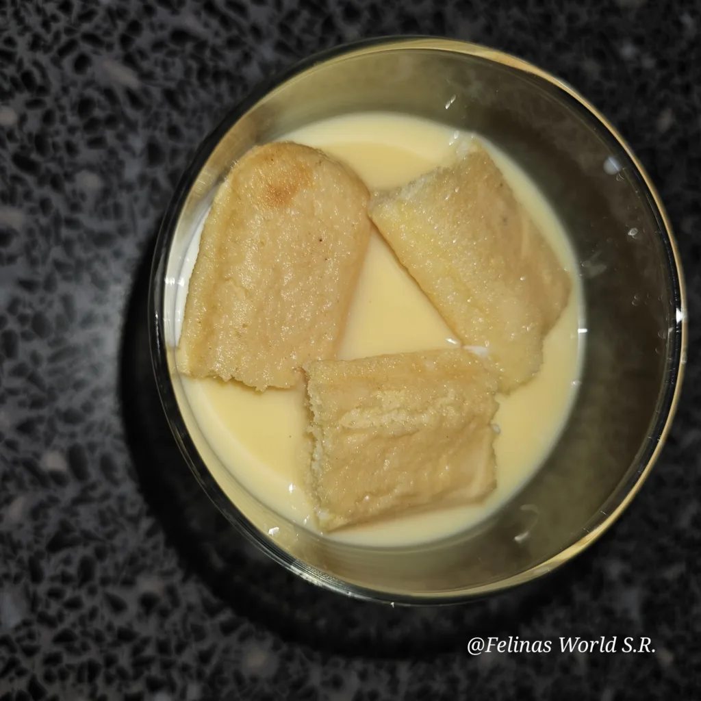 - Milch und Vanillesoße in einen tiefen Teller geben und vermischen150 ml Milch, 50 ml Vanillesoße