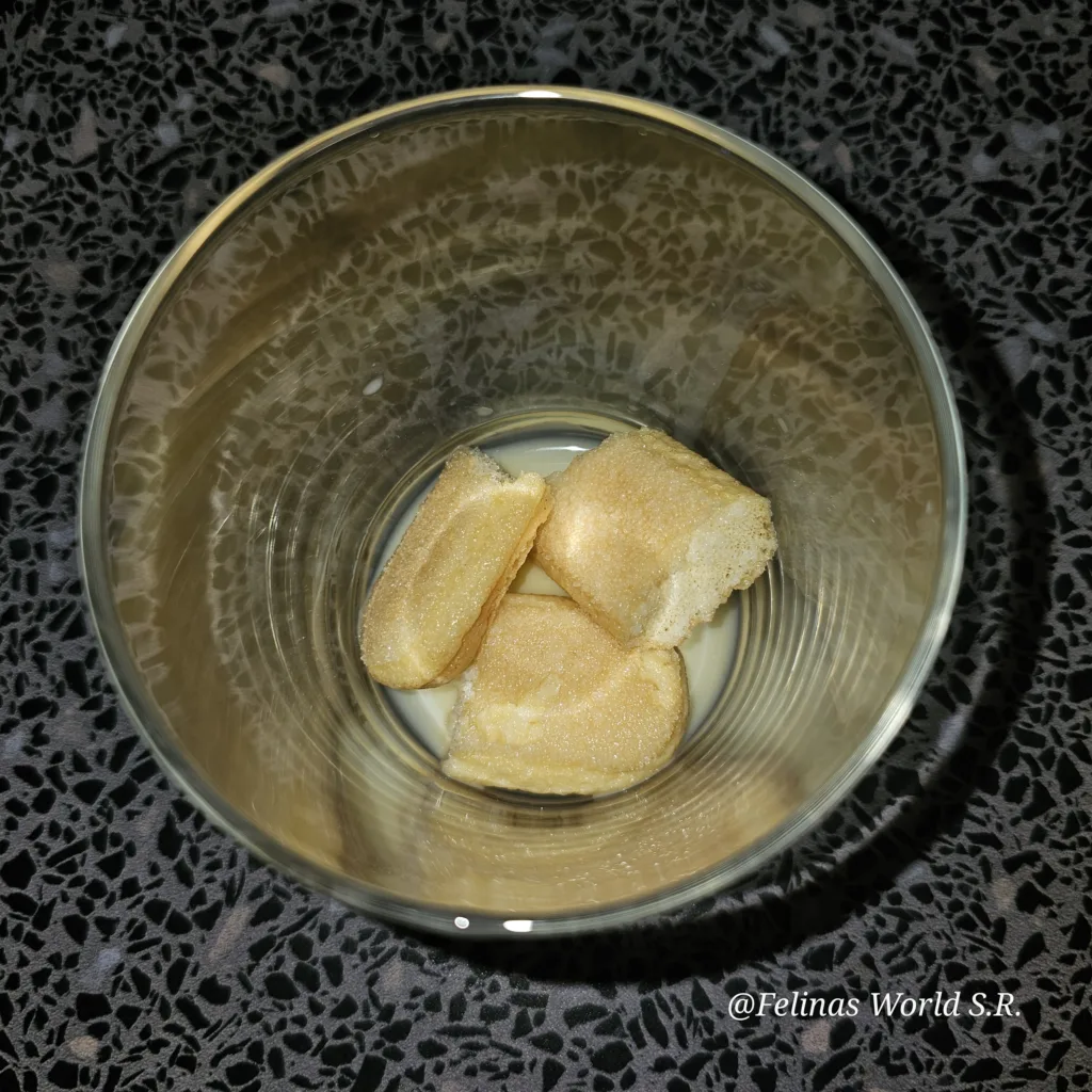 Die Löffelbiskuits zerbrecht ihr in jeweils 3 Teile. Also 9 Teile pro Glas. 3 Teile ergeben eine Schicht. Vor dem Einschichten werden die Löffelbiskuitteile in eine Mischung aus Milch und Vanillesoße getaucht.