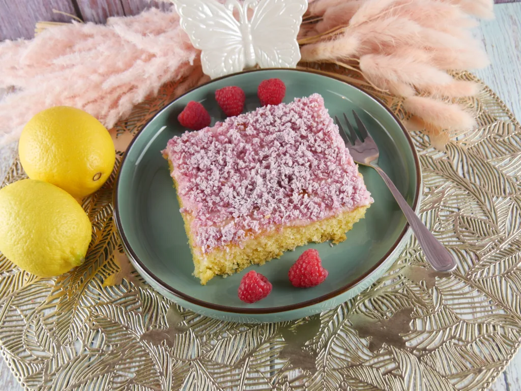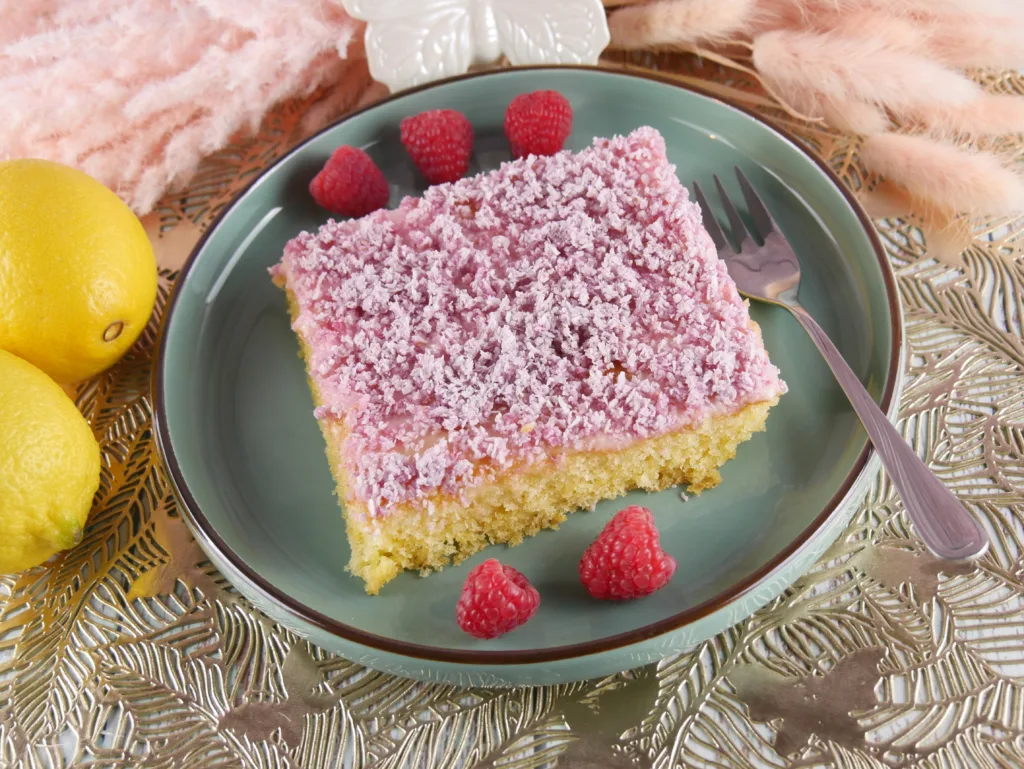 Zitronenkuchen vom Blech mit fruchtigen bunten Kokosraspeln – auch in der zuckerfreien Variante!
